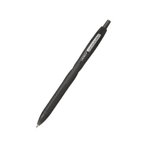 Ручка кулькова автоматична з непрозорим прогумованим пластиковим корпусом, напівпрозорими вставками і пластиковим кліпом. Чорнило підвищеної в’язкості забезпечує суперм’яке письмо. Колір корпусу відповідає кольору чорнила. Пишучий вузол 0,7 мм. Колір чорнила і корпуса: чорний. Стержень UXB-137. Довжина стержня 107 мм.