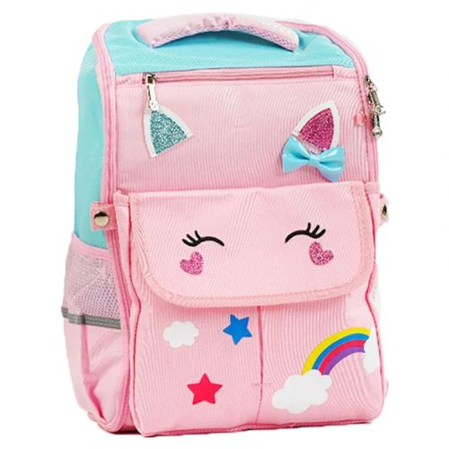 Красивий дитячий рюкзак з жорстким каркасом і зручними лямками, що регулюються по довжині. На лицьовій стороні рюкзака є дві зручні кишені, також оснащений двома бічними кишенями. Має одне просторе основне відділення, всередині якого є кишеня та гумка для фіксації зошитів або іншого приладдя. Має мʼяку ортопедичну спинку та зручну ручку для перенесення рюкзака.
