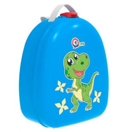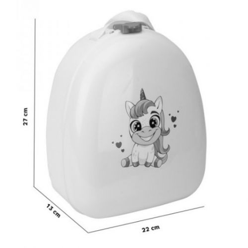 Дитячий рюкзак. Має дві регульовані по довжині ручки та петельку. Виконаний повністю із пластику, з милою картинкою-наклейкою на лицьовій стороні. Розмір 20х24х10 см.