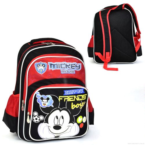 Гарний та якісний рюкзак із зображенням Міккі Мауса. Оснащений ортопедичною спинкою, двома еластичними лямками, мʼякою ручкою для перенесення. Широкі лямки регулюються під зростання дитини, що дозволяє рівномірно розподіляти навантаження на спину. Рюкзак складається з просторого основного відділення, додаткового відділення на лицьовій частині рюкзака, кишені для канцелярського приладдя та двох бічних кишень із тканини та сітки на гумці. Матеріал виробу: щільна, непромокальна тканина – поліестер.