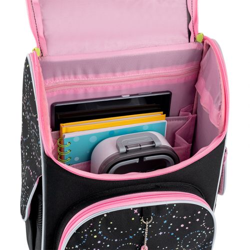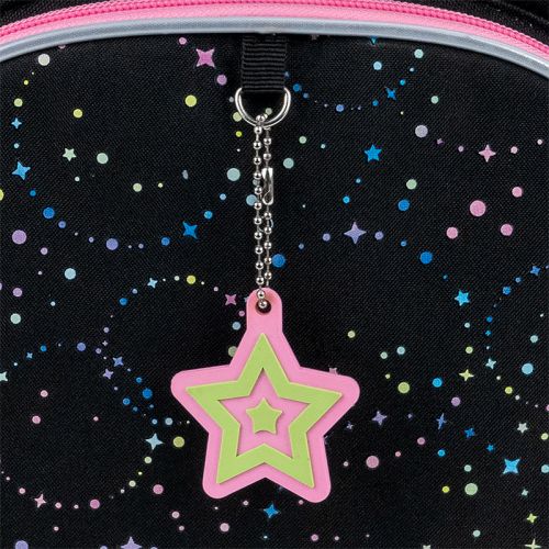 Рюкзак зовні: запатентована ортопедична спинка Ergo Kids; широкі S-подібні лямки; 1 відділення; 1 об’ємна передня кишеня; 2 бічні кишені; світловідбивні елементи; ручка з гумовою вставкою та текстильна петля; знімний нагрудний ремінь; ущільнене дно з захисним покриттям; зносостійкі блискавки; надійна фурнітура. Рюкзак всередині: роздільники з фіксуючою резинкою; кишеня для планшета; міцна підкладка. Декор: об’ємний друк, об’ємний гумовий брелок-підвіска у формі зірочки