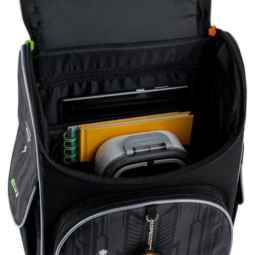 Рюкзак зовні: запатентована ортопедична спинка Ergo Kids; широкі S-подібні лямки; 1 відділення; 1 об’ємна передня кишеня; 2 бічні кишені; світловідбивні елементи; ручка з гумовою вставкою та текстильна петля; знімний нагрудний ремінь; ущільнене дно з захисним покриттям; зносостійкі блискавки; надійна фурнітура. Рюкзак всередині: роздільники з фіксуючою резинкою; кишеня для планшета; міцна підкладка. Декор: світловідбивний друк, об’ємний патч, гумовий брелок-підвіска