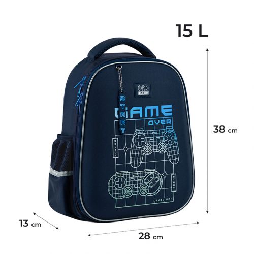 Рюкзак зовні: запатентована ортопедична спинка Ergo Kids; широкі S-подібні лямки; 2 відділення; 2 бічні кишені; світловідбивні елементи; мʼяка ущільнена ручка та текстильна петля; нагрудний ремінь; ущільнене дно з ніжками; зносостійкі блискавки, надійна фурнітура. Рюкзак всередині: роздільники; органайзер. Декор: обʼємний друк, гумова підвіска