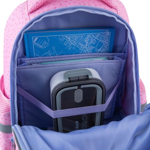 Рюкзак зовні: запатентована ортопедична спинка Ergo Kids; широкі S-подібні лямки; 2 відділення; 1 об’ємна передня кишеня; 2 бічні кишені; світловідбивні елементи; м’яка ущільнена ручка та текстильна петля; знімний нагрудний ремінь; ущільнене дно з захисним покриттям; зносостійкі блискавки; надійна фурнітура. Рюкзак всередині: роздільники з фіксуючою резинкою; кишеня для планшета; органайзер; міцна підкладка. Декор: вишивка лелітками, об’ємний друк, гумовий брелок-підвіска