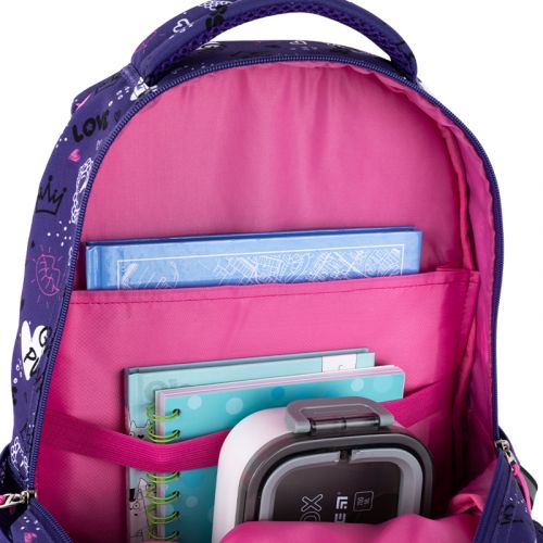 Рюкзак зовні: анатомічна спинка; широкі S-подібні лямки; 3 відділення; 1 об’ємна передня кишеня; 2 бічні кишені; світловідбивні елементи; м’яка ущільнена ручка та текстильна петля; знімний нагрудний ремінь; ущільнене дно; зносостійкі блискавки; надійна фурнітура. Рюкзак всередині: роздільники з фіксуючою резинкою; органайзер, міцна підкладка. Декор: сублімаційний друк