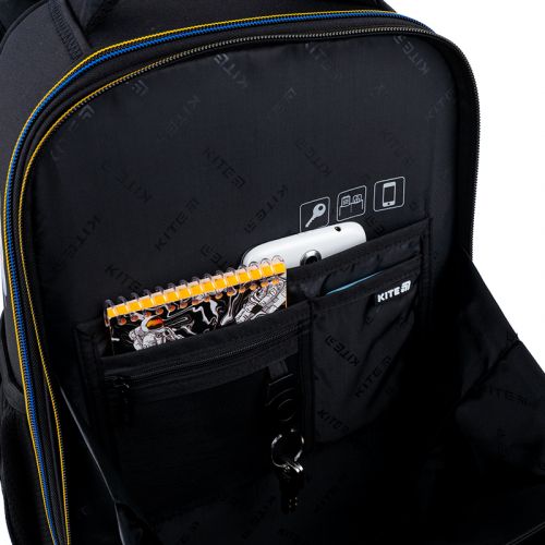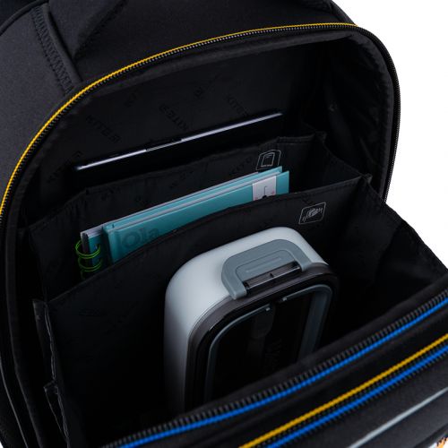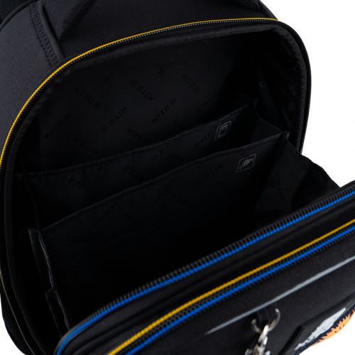 Рюкзак зовні: запатентована ортопедична спинка Ergo Kids; система регулювання спинки під зріст дитини; широкі S-подібні лямки; 2 відділення; 2 бічні кишені; світловідбивні елементи; м’яка ущільнена ручка та текстильна петля; знімний нагрудний ремінь; ущільнене дно з захисним покриттям та ніжками; зносостійкі блискавки, надійна фурнітура; знімний гаманець на карабіні. Рюкзак всередині: роздільники; кишені для планшета та телефона з плюшевою підкладкою; внутрішня кишеня на резинці; органайзер; знімна ключниця; брендована підкладка; поле для персональних даних; навігаційні значки. Декор: світловідбивний друк, гумовий бейдж, об’ємна нашивка, гумовий брелок-підвіска