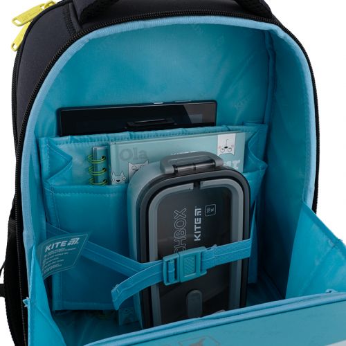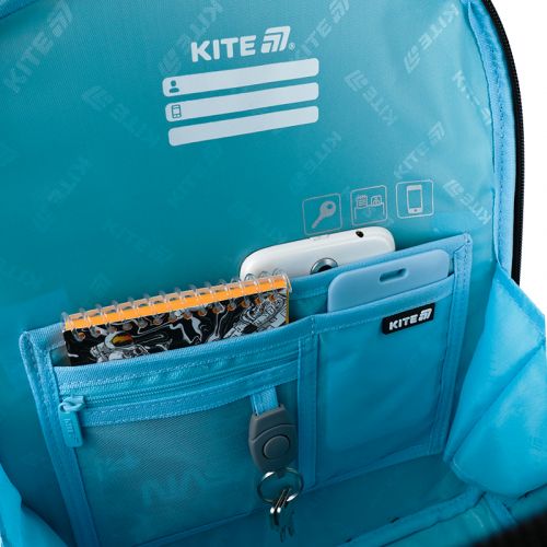 Рюкзак зовні: запатентована ортопедична спинка Ergo Kids; широкі S-подібні лямки; 2 відділення; 1 об’ємна передня кишеня; 2 бічні кишені; світловідбивні елементи; м’яка ущільнена ручка та текстильна петля; знімний нагрудний ремінь; ущільнене дно з захисним покриттям та ніжками; зносостійкі блискавки, надійна фурнітура; знімний гаманець на карабіні. Рюкзак всередині: роздільники з фіксуючою резинкою; кишені для планшета та телефона з плюшевою підкладкою; органайзер; знімна ключниця; брендована підкладка; поле для персональних даних; навігаційні значки. Декор: об’ємний гумовий бейдж, гумові бейджі на липучці, брелок-підвіска з паракорду та гуми на металевому карабіні