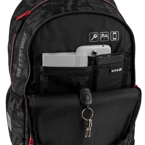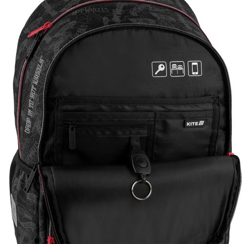 Рюкзак зовні: запатентована ортопедична спинка Ergo Kids; широкі S-подібні лямки; 2 відділення; 1 об’ємна передня кишеня; 2 бічні кишені; світловідбивні елементи; ручка з гумовою вставкою; знімний нагрудний ремінь; ущільнене дно з захисним покриттям; зносостійкі блискавки, надійна фурнітура; знімний гаманець на карабіні. Рюкзак всередині: роздільники з фіксуючою резинкою; кишені для планшета та телефона з плюшевою підкладкою; 1 внутрішня кишеня; органайзер; знімна ключниця; брендована підкладка; поле для персональних даних; навігаційні значки. Декор: сублімаційний друк, світловідбивний друк, нашивка, брелок-підвіска з гуми на металевому карабіні
