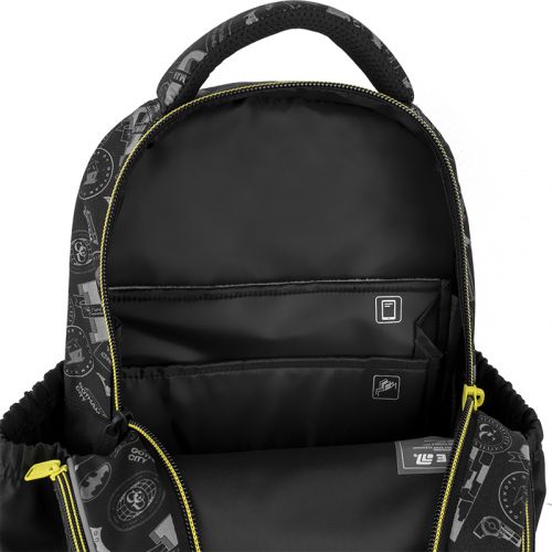 Рюкзак зовні: запатентована ортопедична спинка Ergo Kids; широкі S-подібні лямки; 2 відділення; 1 об’ємна передня кишеня; 2 бічні кишені; світловідбивні елементи; м’яка ущільнена ручка та текстильна петля; знімний нагрудний ремінь; ущільнене дно з захисним покриттям; зносостійкі блискавки, надійна фурнітура; знімний гаманець на карабіні. Рюкзак всередині: роздільники з фіксуючою резинкою; кишені для планшета та телефона з плюшевою підкладкою; органайзер; знімна ключниця; брендована підкладка; поле для персональних даних; навігаційні значки. Декор: об’ємні бейджі, нашивка, брелок-підвіска з комбінованих матеріалів