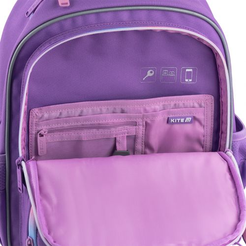Рюкзак зовні: запатентована ортопедична спинка Ergo Kids; широкі S-подібні лямки; 2 відділення; 2 передні кишені на блискавці; 2 бічні кишені; прихована кишеня на спинці; світловідбивні елементи; м’яка ущільнена ручка; знімний нагрудний ремінь; ущільнене дно з захисним покриттям; зносостійкі блискавки, надійна фурнітура; знімний гаманець на карабіні. Рюкзак всередині: роздільники з фіксуючою резинкою; кишені для планшета та телефона з плюшевою підкладкою; 3 внутрішні кишені; органайзер; знімна ключниця; брендована підкладка; поле для персональних даних; навігаційні значки. Декор: об’ємний друк, брелок-підвіска з комбінованих матеріалів