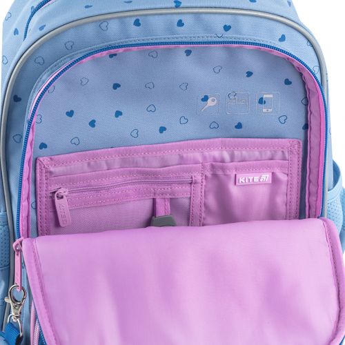 Рюкзак зовні: запатентована ортопедична спинка Ergo Kids; широкі S-подібні лямки; 2 відділення; 2 передні кишені на блискавці; 2 бічні кишені; прихована кишеня на спинці; світловідбивні елементи; м’яка ущільнена ручка; знімний нагрудний ремінь; ущільнене дно з захисним покриттям; зносостійкі блискавки, надійна фурнітура; знімний гаманець на карабіні. Рюкзак всередині: роздільники з фіксуючою резинкою; кишені для планшета та телефона з плюшевою підкладкою; 3 внутрішні кишені; органайзер; знімна ключниця; брендована підкладка; поле для персональних даних; навігаційні значки. Декор: аплікація з комбінованих матеріалів, вишивка, об’ємний друк, брелок-підвіска з комбінованих матеріалів