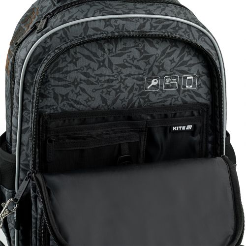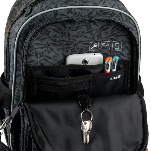Рюкзак зовні: запатентована ортопедична спинка Ergo Kids; широкі S-подібні лямки; 2 відділення; 2 передні кишені на блискавці; 2 бічні кишені; прихована кишеня на спинці; світловідбивні елементи; м’яка ущільнена ручка; знімний нагрудний ремінь; ущільнене дно з захисним покриттям; зносостійкі блискавки, надійна фурнітура; знімний гаманець на карабіні. Рюкзак всередині: роздільники з фіксуючою резинкою; кишені для планшета та телефона з плюшевою підкладкою; 3 внутрішні кишені; органайзер; знімна ключниця; брендована підкладка; поле для персональних даних; навігаційні значки. Декор: світловідбивний друк, об’ємний друк, брелок-підвіска з тасьми та гуми на металевому карабіні