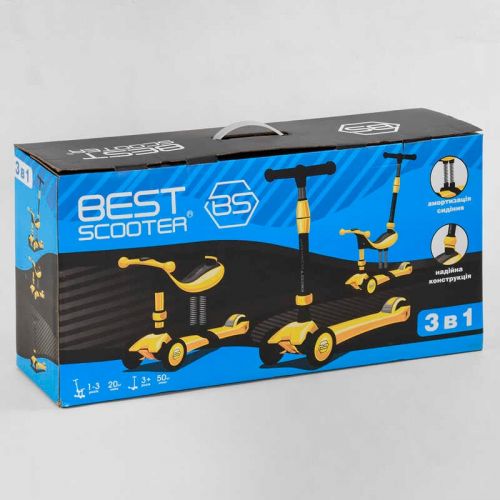 Функціональний триколісний самокат Best Scooter з сидінням і батьківською ручкою та амортизаторами.