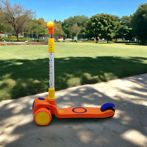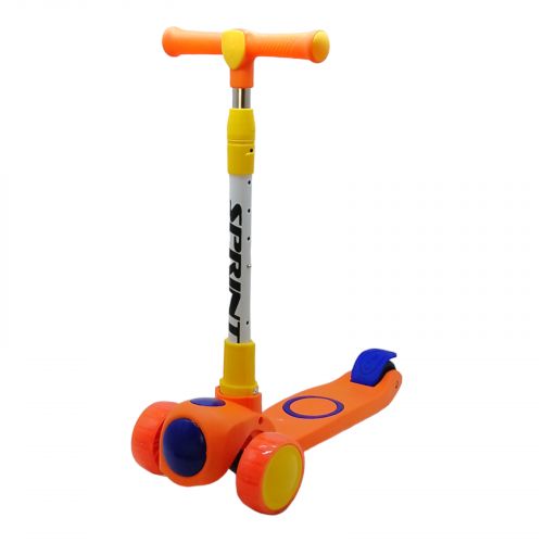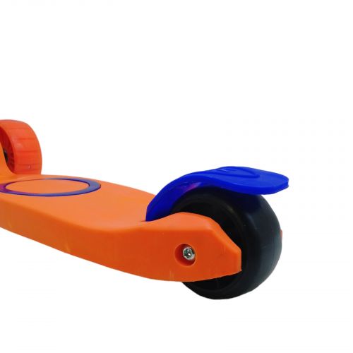 Дитячий триколісний самокат. Розмір деки – 28 х 12 см. Діаметр передніх коліс – 10 см, ширина – 4 см. Діаметр заднього колеса – 7,5 см, ширина – 4 см. Передні колеса PU, з підсвічуванням Задні колеса пластикові, без підсвічування. Висота керма регулюється від 64 см до 76 см. Кермо можна скласти.