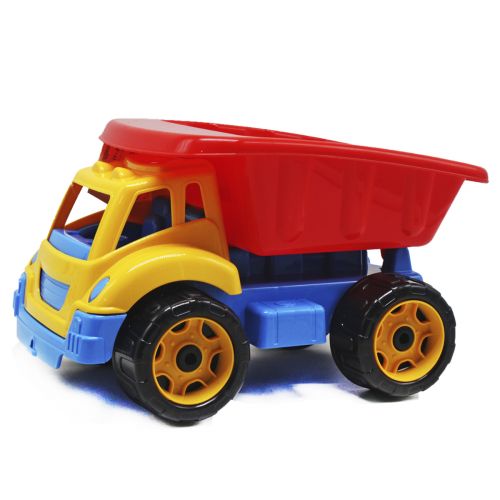 Червоний самоскид з відкидним кузовом з міцного пластику. Спереду на бампері є отвір для кріплення мотузки.