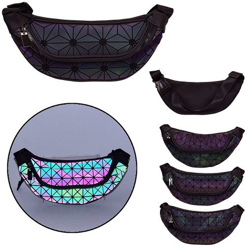Світловідбиваюча сумка бананка. Лицьова поверхня переливається різними кольорами при попаданні на неї променів сонця або яскравого штучного світла фар автомобілів, ламп або ліхтарів. При тьмяному освітленні виріб має сірувато-фіолетового відтінку, але також переливається. Має 1 відділення, яке застібається на блискавку. Розмір сумки- 33х13х9 см. Довжина ремінця регулюється. Різні види геометричних принтів в ассорименті.