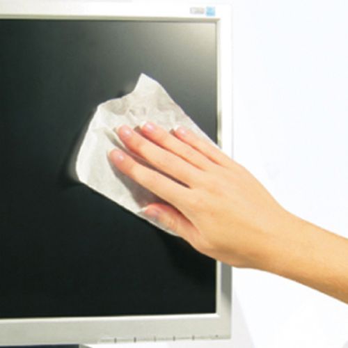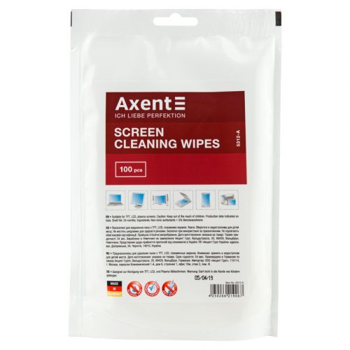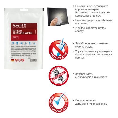 Серветки по догляду за екранами Axent ефективно і дбайливо очищають поверхню TFT / LCD екранів ноутбуків, моніторів, телевізорів, телефонів, планшетів і т.д. Відповідають вимогам міжнародних стандартів. Не містять спирту, не ушкоджують антиблікове покриття, не залишають ворсинок і розводів. Без запаху, дерматологічно безпечні. Матеріал – крепований папір – міцний, еластичний, не пошкоджує поверхню. Мають антистатичні властивості, завдяки чому пил значно менше осідає на поверхню. Забезпечують антибактеріальний ефект. Зручні у використанні: Перемістіть змінні серветки з пакету в тубу. Зніміть кришку туби. Дістаньте серветку з середини рулону і протягніть у отвір у кришці. Відірвіть серветку по перфорації. Щільно закрийте кришку. Протирайте екран у холодному (вимкненому) стані зверху вниз – це захистить від утворення розводів.