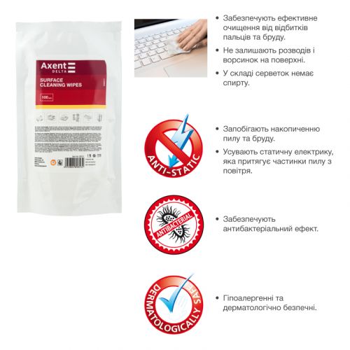 Серветки для догляду за оргтехнікою Delta by Axent – ефективне і доступне рішення для очищення поверхонь оргтехніки і офісних меблів. Дерматологічно безпечні. Матеріал – крепований папір – не залишає ворсинок. Мають антистатичні властивості, завдяки чому пил значно менше осідає на поверхню. Перемістіть змінні серветки з пакета в тубу.