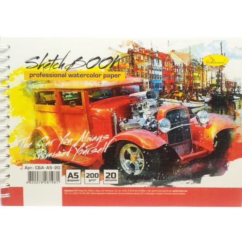 Скетчбук для малювання аквареллю. Альбом має 20 аркушів, розмір А5 на пружинці. Обкладинка із міцного картону. Щільність одного листа 200 г/м2.