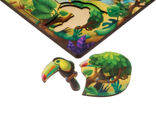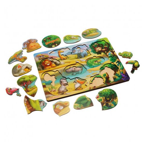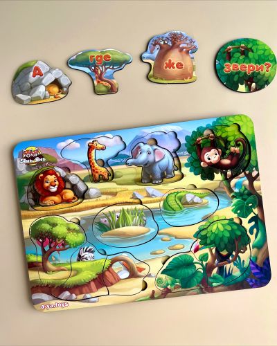Двошарова гра-вкладиш. У нижній шар потрібно помістити тварин, а в верхній – предмети, за якими вони сховалися. Розмір рамки – 31,5х23 см.