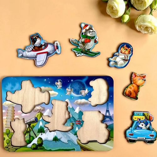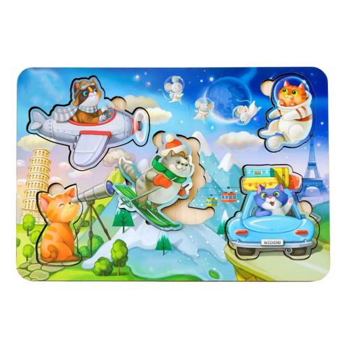 Яскравий тематичний он цього сортера дітям цікаво буде розглядати та вивчати у деталях, а 5 милих вкладишів-котиків зручно діставати пальчиками та вкладати на свої місця за формою. Можна також порахувати котиків і придумати для кожного цікаве імʼя та історію подорожі.