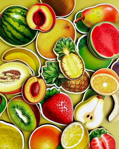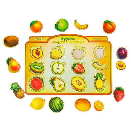Сортер-вкладиш “Фрукти у розрізі”. Двошаровий сортер з фруктами, які виглядають дуже реалістично. Нижній шар – це половинки фруктів (12 вкладишів), а верхній – цілі фрукти. Деталі легко дістаються пальчиками. В ігровій формі можна пояснити дитині що таке “частина” і “ціле”.