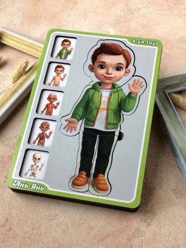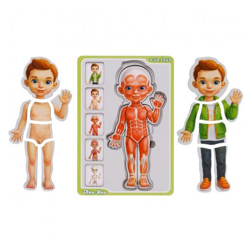 Сортер- пазл “Анатомія” буде чудовим подарунком. Допоможе легко, в ігровій формі ознайомити дитину з особливостями будови людського організму. 5-ти шаровий пазл – це справжнісінький схематичний посібник з вивчення скелета, м’язової тканини, кровоносної системи, шкірного покриву і зовнішнього вигляду людини в одязі. Розмір рамки – 16х23 см.