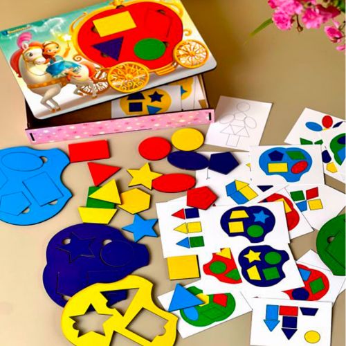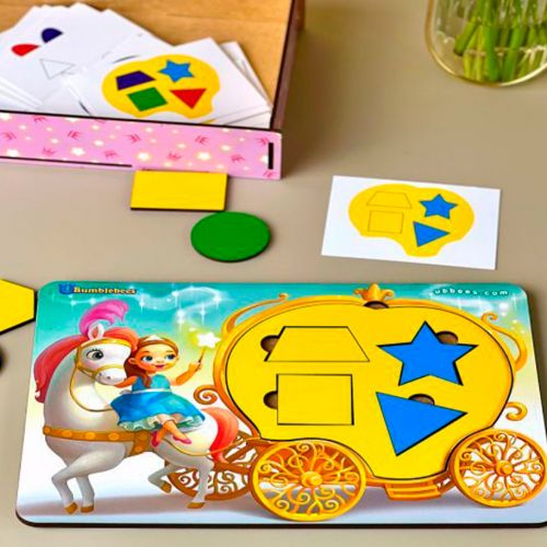 Розвиваюча гра у вигляді карети з віконцями з різних фігур. Карета – це змінні основи 5-ти кольорів. У наборі йдуть 26 карток з візуальними завданнями. Малюкові необхідно вставити різнокольорові фігури в карету потрібного кольору за подобою. Також з фігур можна викласти багато різних візерунків, персонажів, абстракцій. Ця гра – відмінний помічник у вивченні фігур, рахунку та кольорів. Запропонуйте дитині придумати феї імʼя і тоді грати стане ще цікавіше.