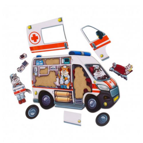 Дерев’яна розвиваюча гра сортер. Зроблено у вигляді машини швидкої допомоги зі знімними елементами. Іграшка допоможе у розвитку дрібної моторики, логіки та візуального сприйняття. Розмір 32х23х1, 5 см.