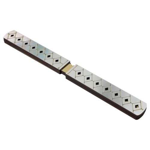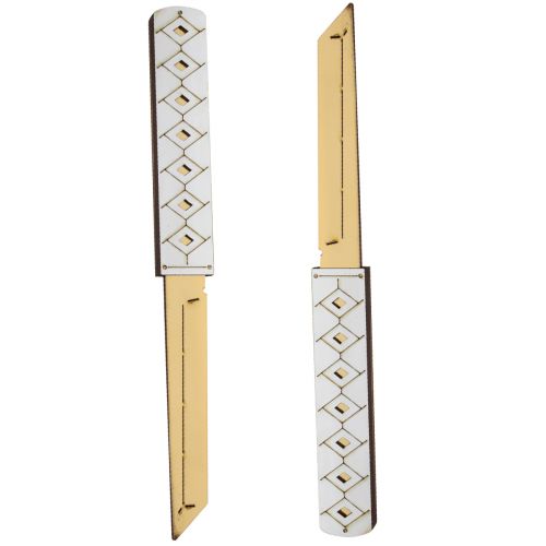 Ножі сувенірі “DOUBLE TANTO”. Матеріал: фанера. Довжина ножа – 28 см, ширина ручки – 3 см. Чудовий подарунок-сувенір. Ніж деревʼяний, якісний та міцний. Не заточений, гострі частини закруглені та зашліфовані, повністю безпечний. В золотисто-сріблястому дизайні. Ножі вставляються один в одного. Для дітей віком від 6 років.