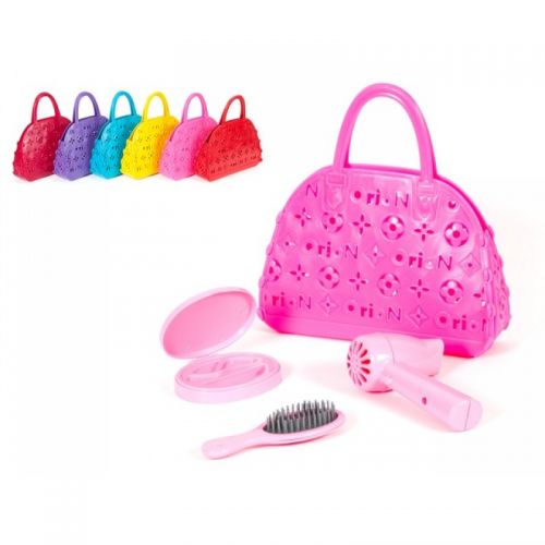 Сумочка дитяча з аксесуарами для волосся. Пластикова сумочка зі спеціальними бічними кріпленнями. В комплекті: сумочка, фен, гребінець, футляр-косметичка (порожній) для тіней і дзеркала. У 5-ти колірних варіантах.