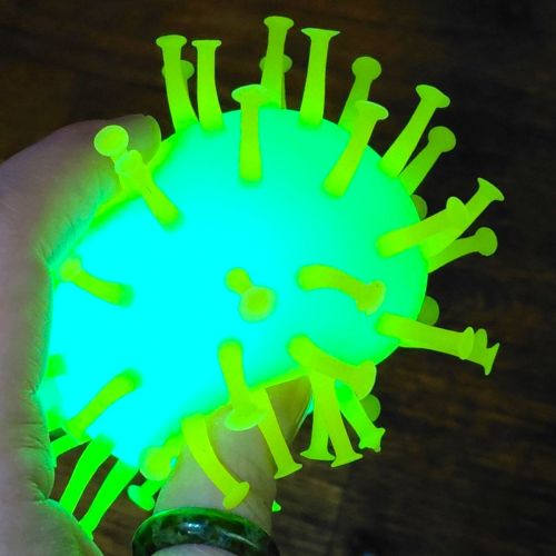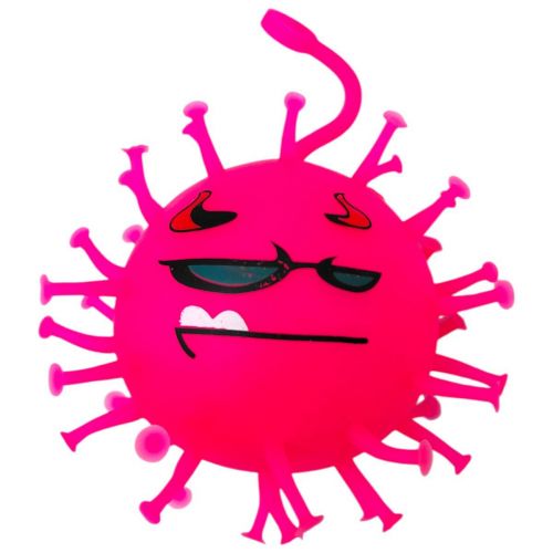 Кумедна світяшка у вигляді вірусу. Іграшка порожня всередині й наповнена повітрям по типу надувної кулі. Всередині іграшки також є пластикова світяшка, що активується при ударі об поверхню. Виконано з якісних та безпечних матеріалів. Для дітей старше 3-х років. Якщо іграшка трошки здута, можна накачати її за допомогою звичайного медичного шприца з голкою (на іграшці є спеціальний отвір).