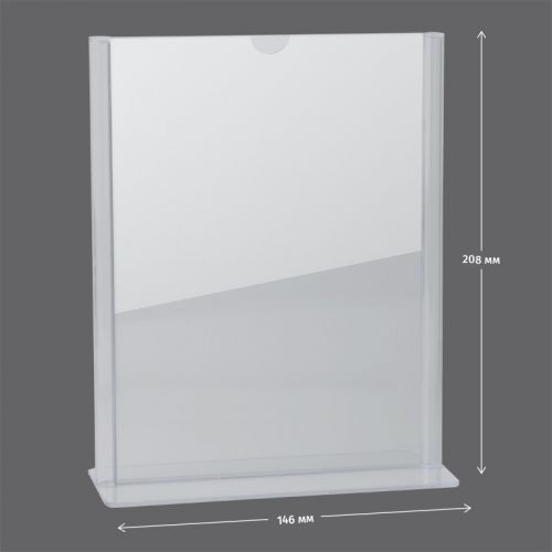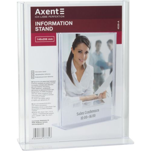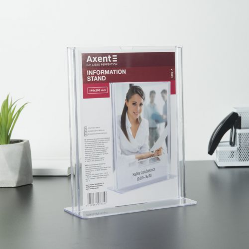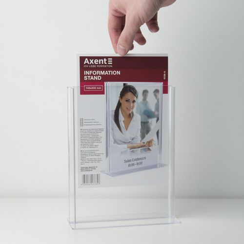 Двосторонні інформаційні таблички широко використовуються для розміщення реклами та іншої інформації при роботі з клієнтами – в банках, ресторанах (наприклад, спеціальні меню), на рецепції готелів, в салонах краси і т.д. Табличка інформаційна двостороння Axent виготовлена ​​з кришталево прозорого пластику (полістиролу), який не порушує передачу кольору і чіткість зображень. Зручна виїмка для пальців дозволяє легко замінити вкладиш в табличці.