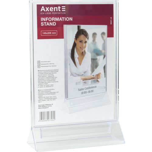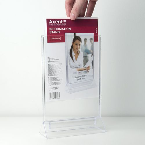 Двосторонні інформаційні таблички широко використовуються для розміщення реклами та іншої інформації при роботі з клієнтами – в банках, ресторанах (наприклад, спеціальні меню), на рецепції готелів, в салонах краси і т.д. Табличка інформаційна двостороння Axent виготовлена з кришталево прозорого пластику (полістиролу), який не порушує передачу кольору і чіткість зображень. Зручна виїмка для пальців дозволяє легко замінити вкладиш в табличці.