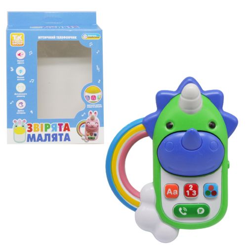 Чарівна інтерактивна іграшка для малечі. Виконана у вигляді телефону у формі звірятка. Має 5 кнопок: велика кнопка – носик звірятка – при натисканні відтворює веселі пісеньки українською мовою; кнопки, які називають літери алфавіту, цифри від 0 до 9, а також різні кольори веселки. Нижня кнопка на іграшці відтворює звуки отримання повідомлень та дзвінка телефону. Працює від 3-х батарейок ААА (немає в комплекті).