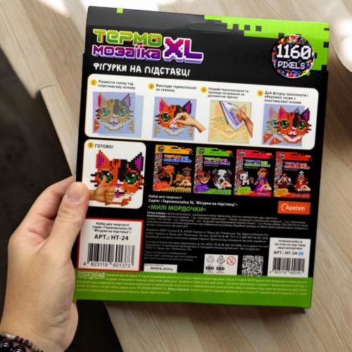 Набір для творчості “Термомозаїка”, з яким дитина зможе зібрати фігурку на підставці. Термомозаїка – це мозаїка з пластмасових різнокольорових намистин циліндричної форми. Ці намистини одягаються на основу – спеціальні планшети з короткими штирьками, а потім прогладжуються праскою через термопапір (кальку). При високій температурі верхній шар пластику плавиться, і намистини скріплюються між собою.