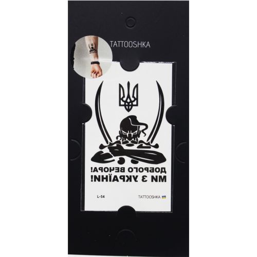 Набір татуювань-перебивок “Tattooshka”. В пакувальному патріотичні татуювання. Вирізати необхідне тату, наклеїти на руку або іншу частину тіла, змочити теплою водою, відклеїти. Розмір листа з татуюванням: 10х6,5 см.