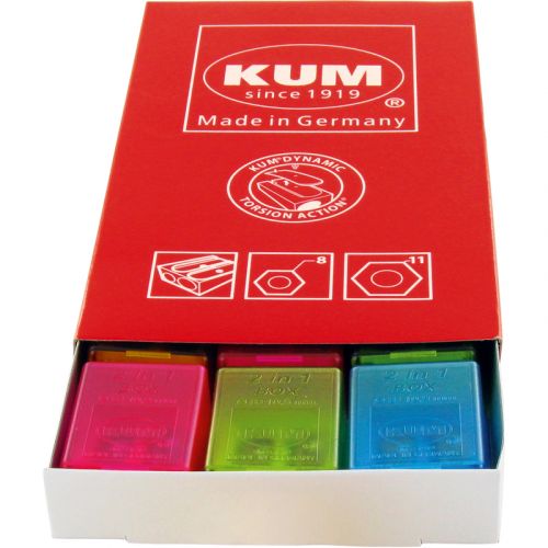 Прямокутна точилка KUM з 2 отворами для заточування олівців діаметром 8 і 11 мм. Компактний міні-контейнер (ідеально підходить для шкільного пенала). Надгострі вигнуті леза з легкістю заточують будь-які олівці, навіть олівці поганої якості. Корпус з первинного пластику дуже міцний, виконаний максимально точно. Леза захищені від іржі. Асорті прозорих кольорів Pop: рожевий, блакитний, салатовий, жовтий.
