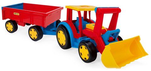 Яскравий пластиковий трактор з рухомим ковшем, причепом і великими колесами. Виготовлений з якісного пластику. Дитина може кататися верхи на тракторі. Вантажопідйомність трактора – 100 кг, причепа – 60кг.