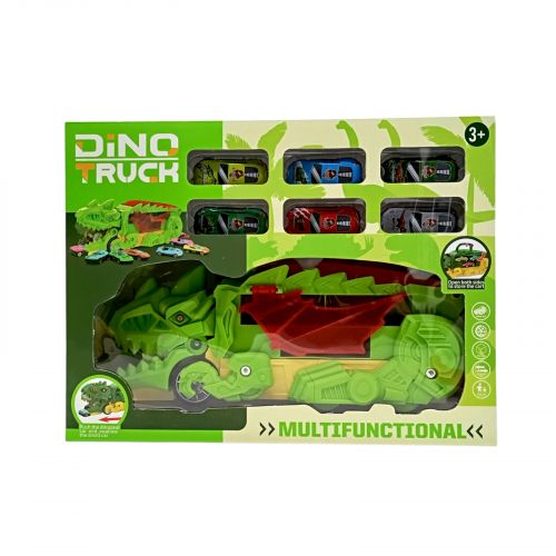 Дитяча іграшка динозавр з машинками – весела та інтерактивна іграшка, яка розважатиме вашу дитину годинами! Мега-транспортер неймовірний Рексоглот має одразу два режими гри. У першому режимі, як транспортер, він може поглинати та перевозити шість машинок, а у другому режимі він перетворюється на тиранозавра з треком на спині. Під час руху хижак «їсть машинки», і вони виїжджають ззаду – у пащі звіра знаходяться спеціальні лопаті, які під час руху підхоплюють міні-машинки та відправляють їх у внутрішній відсік трейлера.
