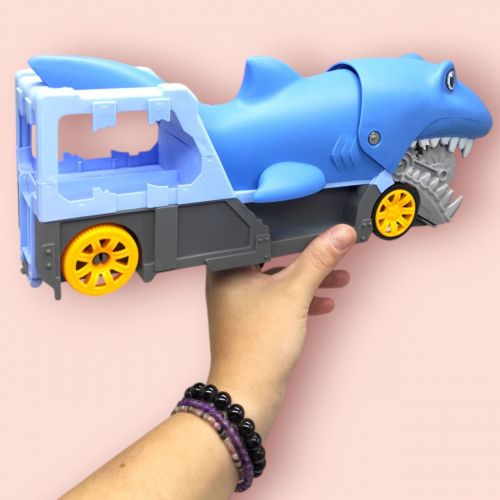 Яскравий та незвичний трейлер у вигляді акули точно зможе зацікавити малюка. Оснащений звуковими ефектами (гарчить при дотику щелеп). У комплекті з трейлером є дві металеві машинки. Машинка може заїжджати в трейлер з будь-якої сторони, та проїхати його наскрізь. Розмір трейлеру – 34х12х7,3 см, діаметр коліс – 4 см; розмір машинки – 7х3х2 см. Виконано з якісних та безпечних матеріалів. Для дітей старше 3-х років.