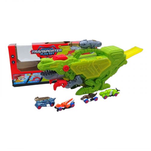 Цікавий трек-паркінг у формі динозавра. Динозавр відкриває рот, є реалістичні звукові та яскраві світлові ефекти. Крутий спуск для машинок додає динаміки і веселощів. А ще в комплекті є пушка, яка стріляє снарядами, дозволяючи створити захоплюючі битви. Набір включає 4 пластикові машинки у вигляді динозаврів, які можна використовувати для заїзду по треку.