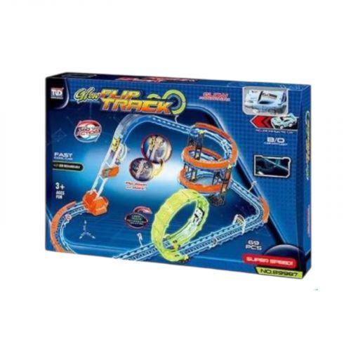 Трек 69 елементів, машинка із вбудованим акумулятором, підсвічування, світиться у темряві, трюки, муляжі оточення, в коробці