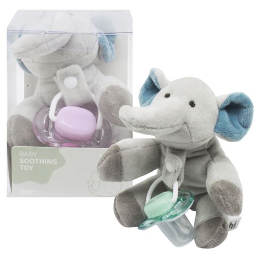 Мила мʼяка іграшка у вигляді слоника, до якої за допомогою зручної петельки на кнопочці кріпиться пустушка. Пустушка в комплекті, розмір: 5х4 см. Іграшка буде прекрасною прикрасою для інтерʼєру та практичним аксесуаром. Розмір слоника: 15х12х9 см.