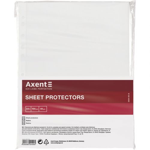 Файли захищають папери від оточуючих впливів і механічних пошкоджень. Завдяки наявності перфорації документи в файлах можуть зберігатися в папках-реєстраторах, в папках на кільцях, в папках-швидкозшивачах та ін. Це забезпечує систематизацію та зручність у роботі з документами. Файли Axent виготовлені з первинного пластику, який забезпечує максимальну прозорість файлу та ідеальну глянцеву поверхню. Корінець надійно спаяний з файлом – файл залишається цілісним і витримує тривалу експлуатацію. Щільність 40 мкм – підходить для частого використання.