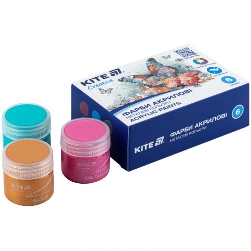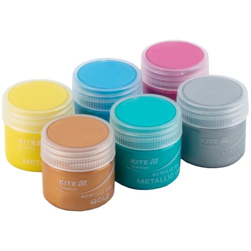 Металізовані акрилові фарби Kite Creative K-273, 6 кольорів, кожна баночка по 20мл. Ці фарби підходять для малювання на різноманітних поверхнях: папір, тканина, кераміка, скло, метал, камінь, дерево, пластик. Фарби легко наносяться, не потребують підготовки поверхні та швидко висихають.. Після висихання фарби водостійкі та стійкі до світла, тому малюнки збережуть свою яскравість і насиченість. Безпечні для дітей — нейтральний аромат і безпечний склад;