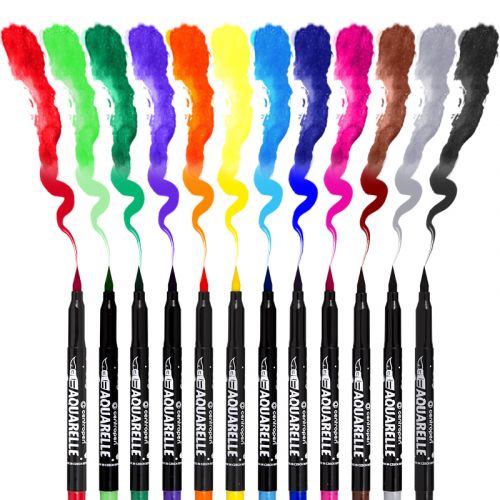 Набір акварельних фломастерів з наконечниками у вигляді пензликів. Фломастери наповнені чорнилом на водній основі, яке можна змішувати з водою для створення плавних градієнтів, тіней і мальовничих акварельних ефектів на спеціальному папері за допомогою пензлика. Після висихання малюнок можна домалювати чорним лінером. Завдяки м’якому пишучому вузлу у вигляді пензлика чудово підходять для різних стилів написів, ілюстрацій, розмальовок, листівок, а також для оформлення щоденників. Ергономічна зона захвату. Ширина лінії: 1-8 мм. Набір із 12 кольорів.
