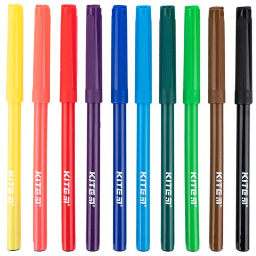 Фломастери на водній основі Kite в картонній упаковці з єврозавісом. У наборі палітра з 10 яскравих фломастерів з вентильованими ковпачками. Вони малюють яскраво навіть при легкому дотиканні до паперу. Чорнила на водній основі легко змиваються . Дитячі фломастери зроблені з поліпропілену, це робить їх стійкими при падінні.