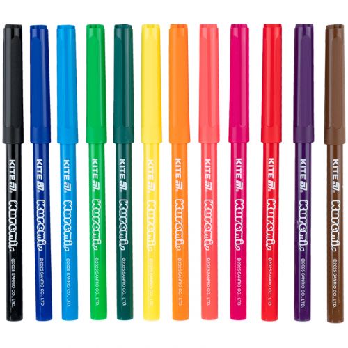Фломастери на водній основі Kite в картонній упаковці з єврозавісом. У наборі палітра з 12 яскравих фломастерів з вентильованими ковпачками. Вони малюють яскраво навіть при легкому дотиканні до паперу. Чорнила на водній основі легко змиваються . Дитячі фломастери зроблені з поліпропілену, це робить їх стійкими при падінні.