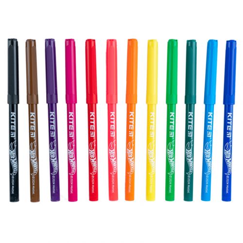 Фломастери на водній основі Kite в картонній упаковці з єврозавісом. У наборі палітра з 12 яскравих фломастерів з вентильованими ковпачками. Вони малюють яскраво навіть при легкому дотиканні до паперу. Чорнила на водній основі легко змиваються . Дитячі фломастери зроблені з поліпропілену, це робить їх стійкими при падінні.